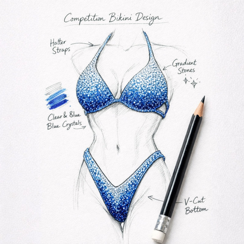 We specialise in competition bikinis made for stage, including suits suitable for IFBB and NPC federations. Every Dream Bikini is designed with the correct cut, coverage and crystal placement to meet competition guidelines while delivering a polished, high-impact stage look.